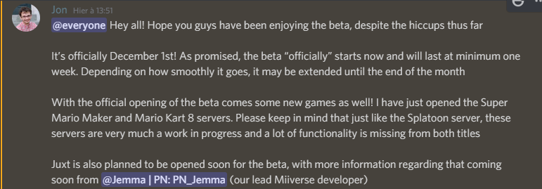 Salut à tous ! J'espère que vous avez apprécié la bêta, malgré les problèmes rencontrés jusqu'à présent. Nous sommes officiellement le 1er décembre ! Comme promis, la bêta commence "officiellement" maintenant et durera au moins une semaine. En fonction de son bon déroulement, elle pourra être prolongée jusqu'à la fin du mois. Il est également prévu d'ouvrir prochainement le serveur de Juxt pour la bêta. Vous trouverez bientôt plus d'informations à ce sujet auprès de @Jemma | PN : PN_Jemma (notre développeur Miiverse principal). |