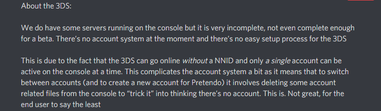 A propos de la 3DS : Nous avons quelques serveurs qui fonctionnent sur la console mais ils sont très incomplets, pas même assez complets pour une bêta. Il n'y a pas de système de compte pour le moment et il n'y a pas de processus de configuration facile pour la 3DS. En effet, la 3DS peut se connecter sans NNID et un seul compte peut être actif à la fois sur la console. Cela complique un peu le système de comptes, car pour passer d'un compte à l'autre (et pour créer un nouveau compte pour Pretendo), il faut supprimer certains fichiers liés au compte de la console pour lui faire croire qu'il n'y a pas de compte. Ceci est. Pas génial, pour l'utilisateur final, c'est le moins que l'on puisse dire. |